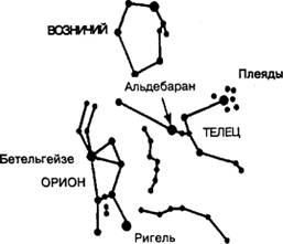 2. Зимой в ночном небе властвует созвездие Ориона, которое поздней осенью восходит над восточным горизонтом около полуночи и заходит незаметно для нас около полудня. Верхняя левая звезда в созвездии Ориона — это красный сверхгигант Бетельгейзе. Звезда в конце его "правой ступни" — голубовато-белый сверхгигант Ригель. Под звездой, образующей оконечность "левой ноги" Ориона, расположен Сириус — ярчайшая звезда ночного неба. К западу от Ориона и немного выше можно обнаружить рассеянное скопление Плеяд в созвездии Тельца.