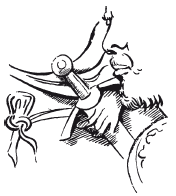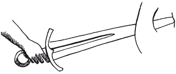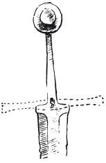 Клинок, хранящийся в моей коллекции, имеет по меньшей мере три необычные черты. Он небольшой, узкий, имеет шестиугольное сечение (то есть является предшественником самого типичного сечения клинка второй половины четырнадцатого века), имеет плечо в верхней части клинка, которое входит в прорезь крестовины, а на хвостовике отпечатано клеймо – «Дикий человек», «Wodewose». Последнее нам знакомо как кузнечное клеймо шестнадцатого и семнадцатого века. Однако здесь мы находим его на мече, определенно относящемся к началу четырнадцатого века. Крестовина короткая и прямая, круглая в сечении и расширяется к концам (стиль 2), большое яблоко типа I в форме колеса (рис. 24) [23]
