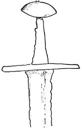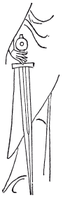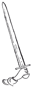 Еще один меч из того же манускрипта интересен тем, что на рисунке показано, как огромная рука хватает очень короткую рукоять меча; яблоко, будучи плоским, помещается в ладонь.