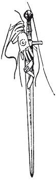 Изучая произведения искусства, мы чувствуем более твердую почву под ногами. На иллюстрациях манускриптов, мемориальных изображениях, портретах и в скульптуре показано очень много типов обтяжки рукояти. Самое распространенное – простая оплетка проволокой или шнуром, но встречаются и более изысканные формы, например на изображении сэра Роберта де Буреса (1302 г.) в Эктоне, Суффолк (рис. 118), сэра Роберта де Септванса (1306 г.) в Чарте, Кент (рис. 93), а также на множестве других изображений в Англии, Германии, Испании и Италии.