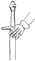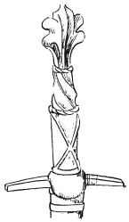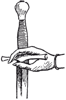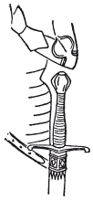 Упоминания в литературе редки, и вряд ли на них можно полагаться. Единственное описание, если его вообще можно назвать таковым, касается «украшения» (garnishing) – термин, который можно применить и к покрытию самой рукояти, и к шапу (капу) (chappe, cape). Шап (кап) – это небольшая пластинка материала, установленная между крестовиной и рукоятью, которая опускается на каждую сторону 'ecusson крестовины и закрывает устье ножен. Эта деталь ни в коем случае не использовалась повсеместно и обязательно, но зато представлена в произведениях изобразительного искусства (рис. 79, 80, 113, 115, 117).