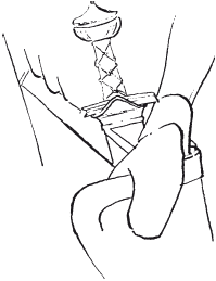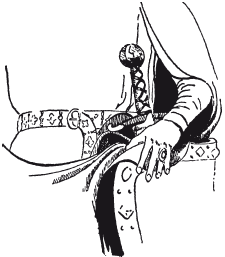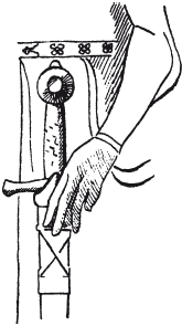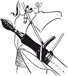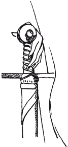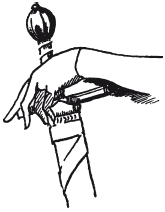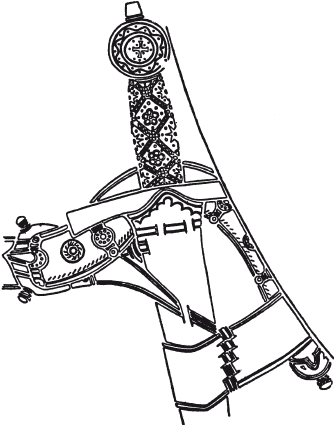 Замысловатая оплетка рукояти меча на изображении Буреса, вероятно, является изысканной вышивкой, поверх которой наложена оплетка из шнура. Памятник графу Ульриху фон Вюртембергу в Штифтскирхе, Штутгарт, датированный 1270 годом, демонстрирует рукоять, покрытую, как мне кажется, тесно переплетенными кожаными ремешками, хотя не исключено, что скульптор таким образом изобразил проволочное плетение. Покрытая таким образом рукоять была найдена в Торсбьёрге, Дания, на римском оружии второго века нашей эры. И конечно, это был обычный метод оплетки рукояти в семнадцатом веке, знакомый практически всем (рис. 121).