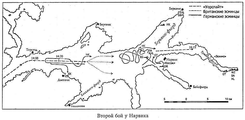 Поднявшийся в воздух с «Уорспайта»разведывательный гидросамолет «Суордфиш» в 13:03 обнаружил «Кюнне», а в 13:10 находившийся несколько восточнее «Кёльнер». Но визуальный контакт с «Кюнне»передовые британские эсминцы «Бедуин»и «Коссэк»установили только в 13:28 и еще через 2 минуты открыли по нему огонь с предельной дистанции. Между тем британский гидросамолет осмотрел Нарвик и близлежащие фьорды. У входа в гавань воздушный разведчик заметил эсминец «Ганс Людеман», а в Херьянгс-фьорде — подводную лодку «U 64». Решение атаковать пришло почти мгновенно. Пилот Райс направил свой «Суордфиш» в пикирование и, когда машина находилась всего в 60 метрах над целью, сбросил две 100-фунтовые бомбы. Одна из них упала рядом с бортом «U 64», зато другая угодила прямо в рубку. Подводная лодка затонула. 35