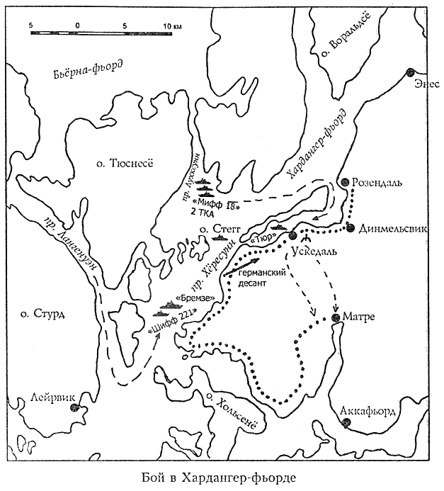 Тем временем, 21 апреля объединившийся десант взял Энес, спустя три дня переправился через фьорд и занял Нурхеймсунн, а 25 апреля против Восса была предпринята трехсторонняя атака силами 159-го и 193-го полков. Три пехотные роты с артиллерией наступали вдоль железной дороги, одна — по северному берегу фьорда, попутно захватив Ольвик, еще три роты были высажены с кораблей в глубине фьорда у Эйде и атаковали с фланга и тыла. Высадку и артиллерийскую поддержку десанта осуществляли «М 1», «Шифф 18», пять торпедных катеров под командованием {262 --> Бирнбахера и трофейный пароход «Конг Олав II». Атака была молниеносной и увенчалась успехом. Утром 26 апреля германские войска вошли в Восс. Фактически переставший существовать отряд Хардангер-фьорда был официально расформирован 2 мая.