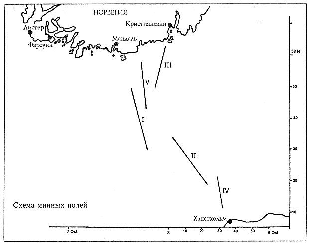 Невысокую активность немцев можно объяснить тем, что на начальном этапе кампании базировавшиеся в Согне-фьорде {264 --> силы не представляли для них реальной угрозы. По мере распространения зоны боевых действий на север меры, предпринимаемые против норвежского отряда, приобрели более выраженные формы. В качестве первого шага была разработана операция по блокированию горла Согне-фьорда минными заграждениями, о которой 29 апреля «Адмирал западного побережья» доложил Руководству войной на море. Применяться должны были норвежские мины, в большом количестве захваченные на складах в Бергене. Для операции были привлечены трофейные минзаги «Тюр», «Уллер»и миноносец «Бранд». В тот же вечер они вышли из Бергена. Командовавший группой капитан-лейтенант Борхардт намеревался перегородить узость между Лоснеё и Рутлетангеном.