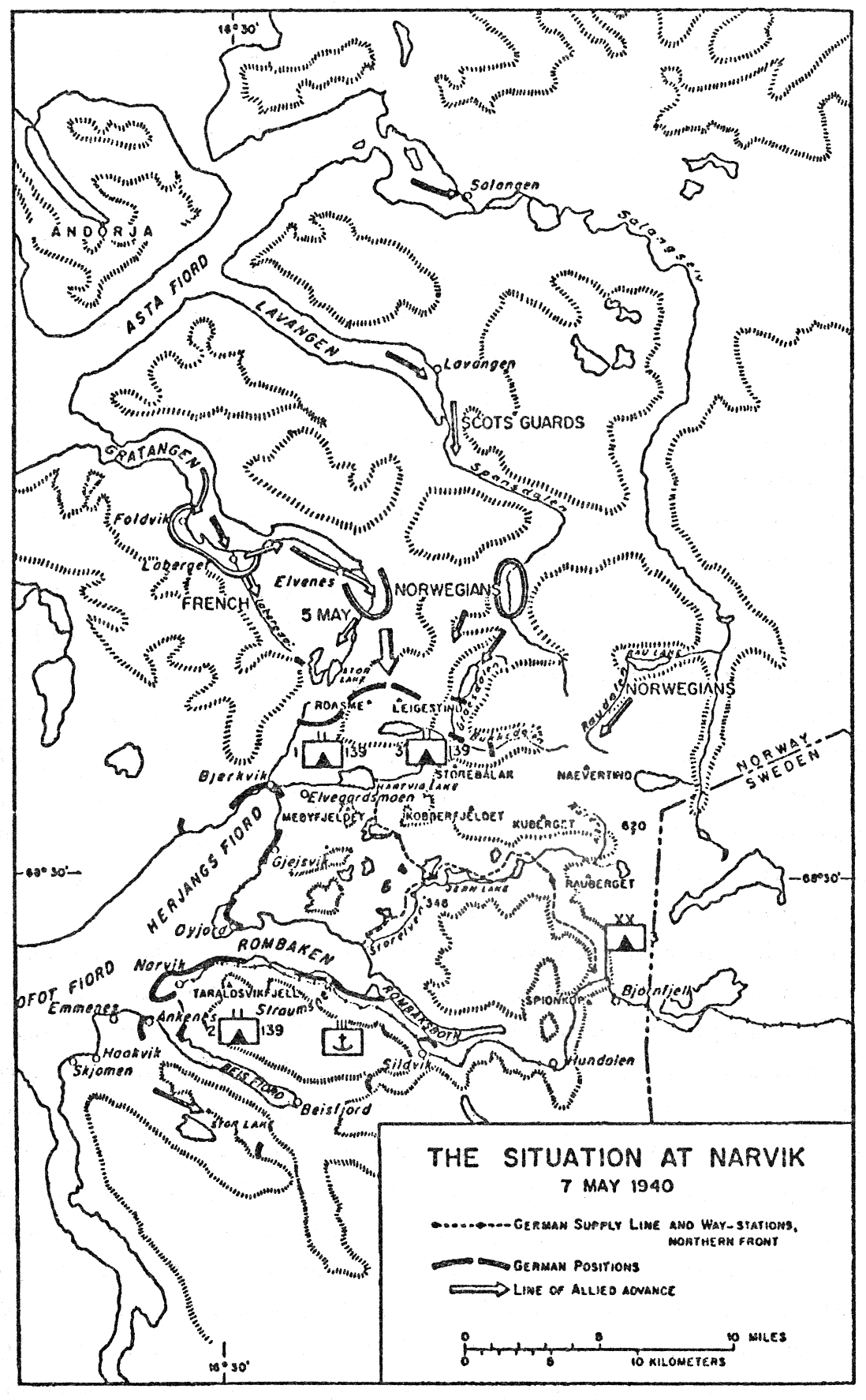 Самое многочисленное пополнение остро нуждавшаяся группа приобрела в лице моряков с погибших эсминцев. Их вооружили винтовками и пулеметами из захваченного в Эльвегордсмуэне арсенала и свели в три батальона морской пехоты (примерно по 700 человек в каждом), командирами которых стали Ганс Эрдменгер, Эрих Бей и Гюнтер Коте. Два первых действовали в районе Нарвика, а батальон Коте был придан группе Виндиша. (Позже все три батальона были сведены в полк под командованием капитана 2 ранга Бергера.) Конечно, в действиях на суше матросы не шли ни в какое сравнение с прекрасно подготовленными горными егерями, но в обороне показали себя стойкими бойцами. Остальные 500 моряков, главным образом технических специалистов, помогали саперам, ремонтировали железнодорожный транспорт и выполняли различные работы. С помощью флотских механиков в железнодорожных мастерских Нарвика был построен импровизированный бронепоезд, вооруженный легкими орудиями и пулеметами. Впоследствии он очень помог горным стрелкам в сражении с норвежцами, блокировавшими железную дорогу.