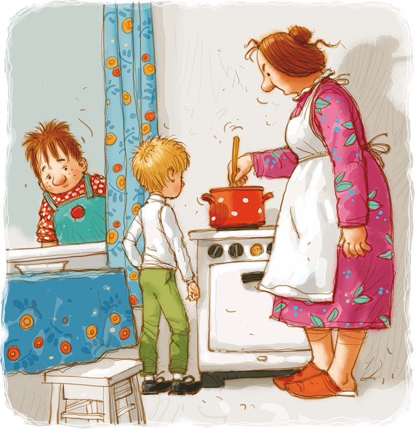 Малыш оделся и пошёл на кухню, чтобы рассказать фрёкен Бок, что его больше не надо изолировать. Она уже готовила завтрак.