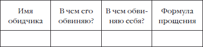 Ну и, наконец, в последнем столбце необходимо закрепить результат, простив обидчика и саму себя. Напиши в четвертом столбике напротив каждого имени: «Я с радостью прощаю ___________(имя) и принимаю его таким, какой он есть! Я благодарю его за то, что он указал мне на мои недостатки и помог от них освободиться. Я принимаю себя такой, какая я есть. Я прощаю себя за свой негатив и наполняюсь радостью, благодарностью, любовью и приятием! Я прошу прощения у ______________(имя) за то, что обижалась на него».