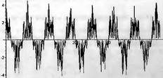 Рис. 11.60. Картина звуковых волн от источника звука, перемещаемого с переменной скоростью, в конце превышающей скорость звука