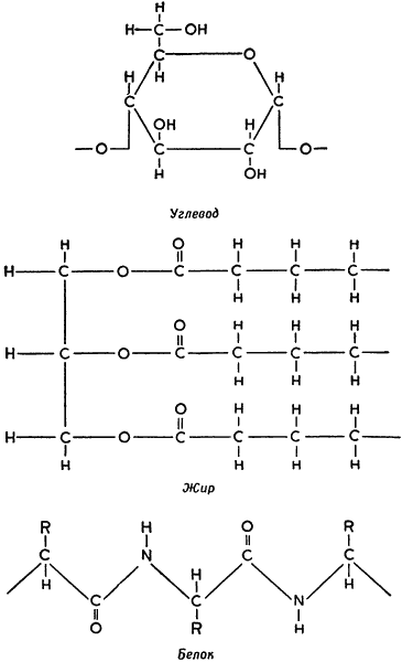Рис. 2. Химические формулы трех классов органических соединений, из которых состоят все живые организмы, — углеводов, жиров и белков.