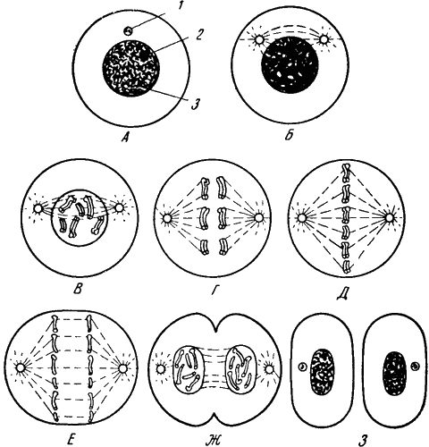 А — стадия покоя; Б — ранняя профаза (центриоль разделилась, появляются хромосомы); В — более поздняя профаза (хромосомы раздвоились, но еще остаются связанными); Г — поздняя профаза (ядерная оболочка растворилась, имеется веретено); Д — метафаза (хромосомы расположились по экватору веретена); Е — анафаза (хромосомы движутся к полюсам); Ж — телофаза (образовались ядерные оболочки, хромосомы удлиняются, начинается деление цитоплазмы); З — дочерние клетки (стадия покоя). 1 — центриоль; 2 — ядрышко; 3 — хроматин.
