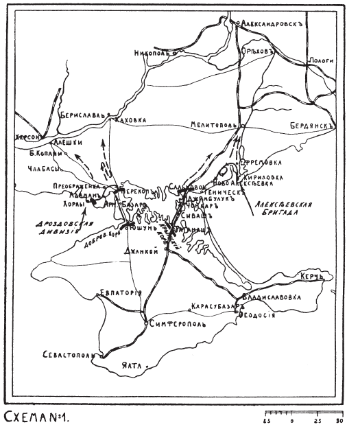31 марта в районе Перекопа разыгрался упорный встречный бой. (Схема № 1) [74] . Со стороны противника действовала 1-я латышская дивизия с конницей. 2-й донской дивизией генерала Морозова, поддержанной нашей пехотой, аэропланами, броневиками и танками, противник был разбит. Перекопский вал и ближайшие подступы остались в наших руках. 1 апреля красные, подтянувши только что прибывшую 3-ю стрелковую дивизию и сосредоточивши до трех тысяч конницы, пытались снова наступать, но, встреченные нашей контратакой, были отбиты. В этот день наш правый десант – Алексеевская бригада, имевший целью отвлечь резервы красных, благополучно высадился у д. Кирилловки, в сорока верстах северо-восточнее Геническа, и занял село Ефремовку. Однако при дальнейшем продвижении на соединение со своими частями в районе Геническа алексеевцы были атакованы красными и, не проявив должной стойкости, стали отходить, причем понесли значительные потери.