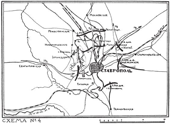 Продолжая наступление, дивизия 28 октября подошла к станице Сенгилеевской. Противник, разбитый и подавленный предыдущими боями, оказывал слабое сопротивление и ночью, прикрывшись арьергардами, отошел на Ставрополь. 30 октября мои части подошли к Ставрополю и к вечеру закрепились на опушке леса к западу от города. Правофланговая бригада полковника Топоркова держала связь с частями генерала Казановича в районе села Татарка. На левом моем фланге части генерала Чекотовского соприкасались с частями 3-й пехотной дивизии полковника Дроздовского, левей которого, южнее станции Пелагиада, охватывая Ставрополь с севера, вела бой 2-я пехотная дивизия генерала Боровского. Мой резерв, корниловцы и екатеринодарцы, под общей командой доблестного командира Корниловского полка полковника Бабиева (полковник Науменко отбыл в Екатеринодар для участия в заседаниях кубанской рады) сосредоточился в немецкой колонии Иогансдорф. Пути отхода противника на восток и северо-восток были отрезаны к северу от железнодорожной ветки Ставрополь – Петровское кубанцами полковника Улагая, к югу 1-й кубанской дивизией генерала Покровского. К вечеру обе эти дивизии связались с соседями и тактическое окружение таманской армии красных было завершено.