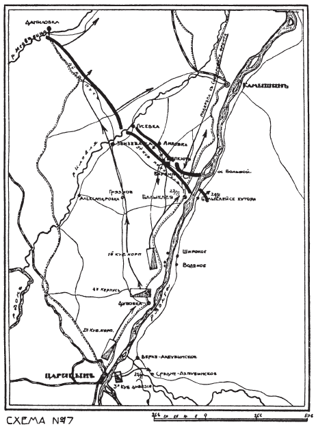 б) 4-му корпусу (1-я конная и Сводно-горская дивизии) под командой генерала Успенского [31] , выйдя через деревни Грязная – Зензеватка к реке Иловля, развернуться между этой последней и рекой Медведицей, на фронте Гусевка – Даниловка, имея задачей в дальнейшем наступлении выйти на фронт Камышин – Красный Яр;