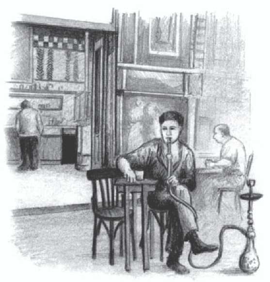 Один из главных аттракционов Каира — конечно же, кофейни. Махфуз в романе «Среди дворцов» изображает одну кофейню, которая «находилась ниже уровня мостовой, как пещера, вырубленная в скале. Она словно пряталась под старинными зданиями этого квартала. Узкие помещения, обращенные входами друг к другу, располагались вокруг пересохшего фонтана во внутреннем дворике, отрезанном от мира. Светильники горели там днем и ночью, атмосфера была спокойной, мирной, почти сонной… Уединенность делала ее идеальным укрытием от любопытных взглядов. Люди просиживали там вечера напролет, разговаривая, планируя, предсказывая и ожидая грядущих событий».