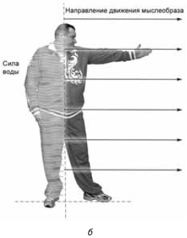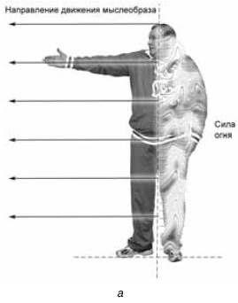 Встаньте прямо. Правую руку вытяните вправо параллельно опоре. Правую стопу и голову поверните вправо. Возьмите для работы пульсовой темп 4-2-4 или 8-4-8. Идеомоторно поделите ваше тело на правую и левую половины относительно центральной оси. На вдохе наберите в левую половину тела Силу первостихии Огня. Представьте ее так, как вы чувствуете. На задержке дыхания сконцентрируйте внимание на левой половине тела. Можно почувствовать, как оно «загорается». На выдохе Силу Огня проведите через всю правую половину тела горизонтально вдаль. Повторите 4 раза (фото 34, а).