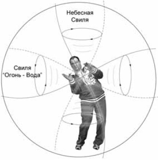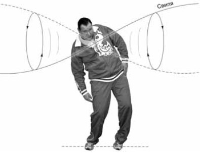 Начинаем работать со «Свилей Огня – Воды». Представьте, что через вас проходит Горизонтальная Вервя и кто-то крутит ее справа и слева от вас. Плечи начинают вращаться соосно, образуя два конуса. Правый конус с вершиной в центре Яра основанием открывается направо, левый конус также с вершиной в центре Яра открывается, соответственно, влево. При вращении в «Горизонтальной Свиле» руки опущены вдоль тела, основную работу выполняют плечи. Различают «Горизонтальную Свилю» с соосным вращением плечей вперед и назад (фото 35). В процессе наработки «Свили Огня – Воды» вы почувствуете, что «Горизонтальная Свиля» без выполнения «Вертикальной Свили» практически невозможна. Ну и слава Богу.