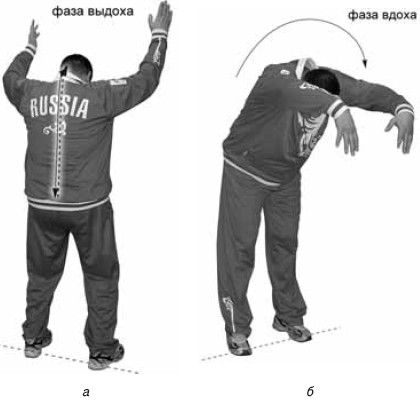 Если область крестца стала резко нагреваться, надо тут же прекратить упражнение и сделать «Дождь». Если все нормально, то есть ощущаем только плотность и легкую теплоту, то переходим ко второй фазе упражнения 3. Резко расслабившись, надо схватить воздух ртом и носом (вдох). При этом нужно сделать хлесткий бросок верхней половиной тела и рук вперед, по типу упражнения «Плетень» («Славянская здрава», с. 152–153) (фото 47, б). Далее снова «выдох» в позвоночник и т. д. Повторите 3, 7, 9 раз.