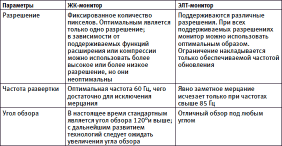 К преимуществам ЖКИ-мониторов можно отнести то, что они действительно плоские в буквальном смысле этого слова, а создаваемое на их экранах изображение отличается четкостью и насыщенностью цветов. У них отсутствуют искажения на экране, и они лишены массы других проблем, свойственных традиционным ЭЛТ-мониторам. Стоит добавить, что потребляемая и рассеиваемая мощность у ЖКИ-мониторов существенно ниже, чем у ЭЛТ-мониторов. В табл. 7.2 приведена сравнительные характеристики мониторов ЖК и ЭЛТ.