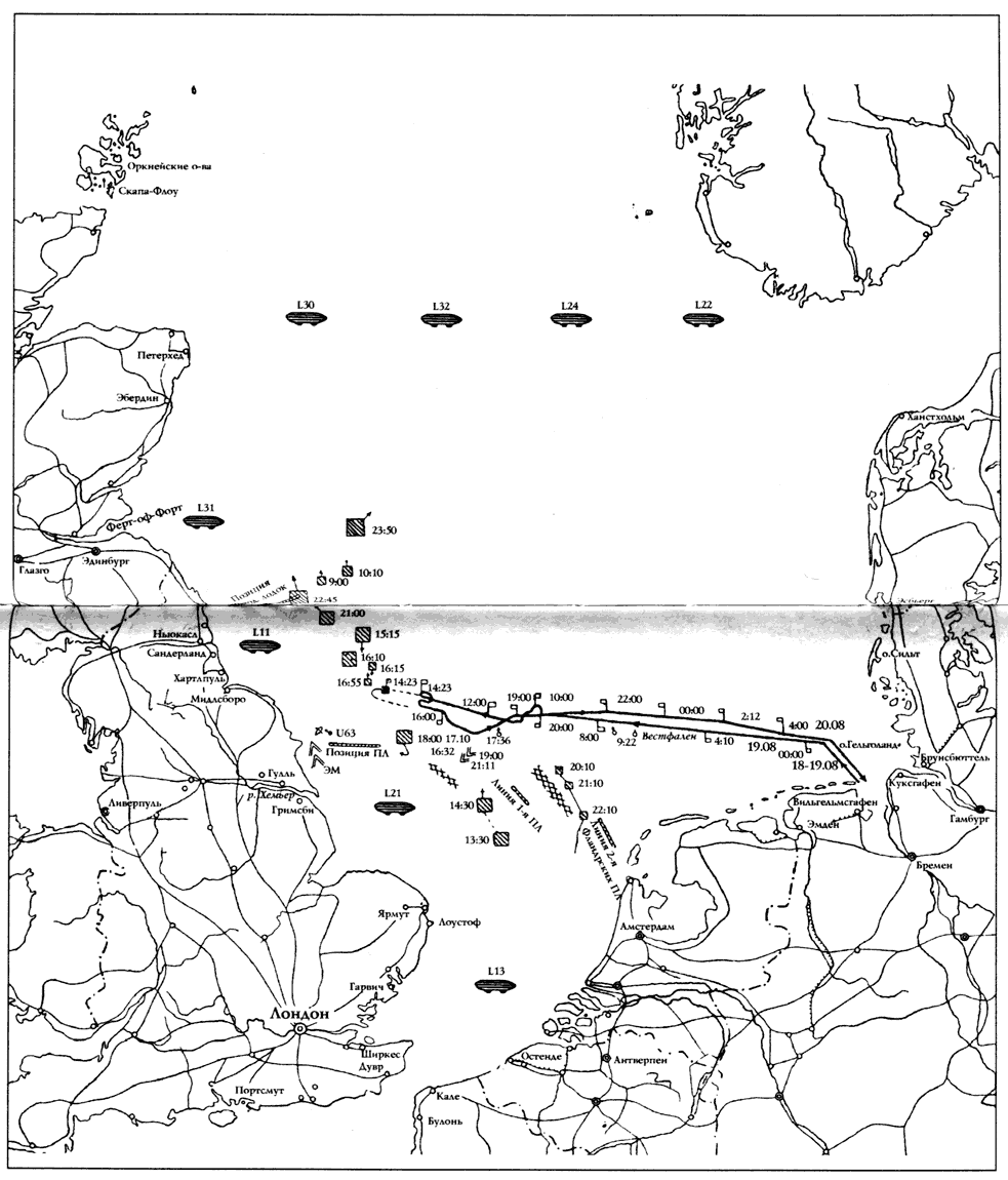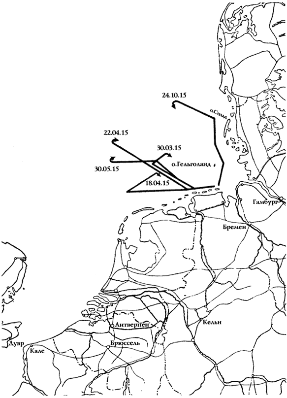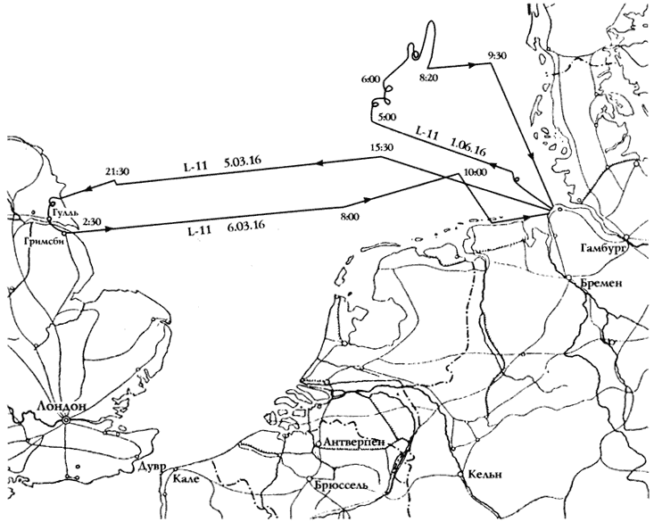 Схема 13. Полеты дирижабля L-11 5 марта и 1 июня 1916 г. (стр. 179)