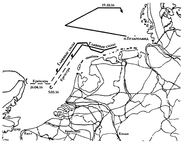 Схема 14. Выходы Флота Открытого моря в марте, апреле и октябре 1916 г. (стр. 193)