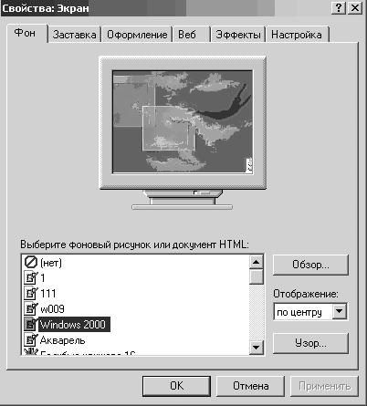 Операционная система Windows 2000 позволяет использовать в качестве фона Рабочего стола фоновый узор, фоновый рисунок или документ в формате HTML (в этом формате представляются Web-страницы Интернета). Выбор метода оформления осуществляют на вкладке Фон диалогового окна Свойства: Экран, которое открывают с помощью значка Экран в окне Панель управления или посредством пункта Свойства контекстного меню Рабочего стола.