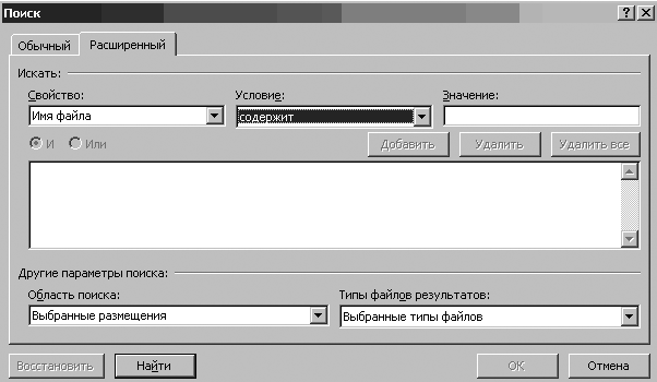 Для поиска документа выберите из меню Файл – Открыть – Сервис – Найти (рис. 5.3). Развернется диалоговое окно, где можно указать критерий поиска.