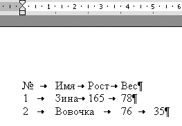 Клавиша Пробел учитывается как символ клавиатуры, нельзя перемещать или выравнивать текст с помощью пробелов, это надо делать, используя клавишу Tab, иначе при распечатывании текста на бумаге или дальнейшем преобразовании текста в другой формат могут возникнуть неприятности в оформлении (ненужные смещения, переносы строк и т. п.). На рисунке 5.6 можно видеть оформление документа с применением табуляции (стрелочка).