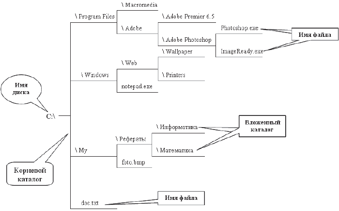 Все современные операционные системы позволяют создавать каталоги. Правила присвоения имени каталогу ничем не отличаются от правил присвоения имени файлу, хотя негласно для каталогов не принято задавать расширения имен. Все промежуточные каталоги разделяются между собой обратной косой чертой (\). На рисунке 2.1 приведен пример иерархической структуры диска C: