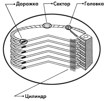 Все современные дисковые операционные системы обеспечивают создание файловой системы, предназначенной для хранения данных на дисках и обеспечения доступа к ним. Принцип организации файловой системы – табличный. Поверхность жесткого диска рассматривается как трехмерная матрица, измерениями которой являются номера поверхности, цилиндра и сектора. Под цилиндром понимается совокупность всех дорожек, принадлежащих разным поверхностям и находящихся на равном удалении от оси вращения. Физическая структура хранения данных представлена на рисунке 2.2.