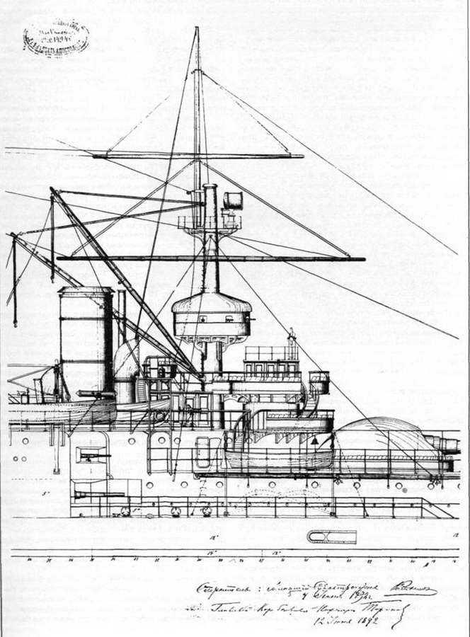 Эскадренный броненосец «Двенадцать Апостолов». Вид на фок-мачту. Репродукция с отчетного чертежа за подписью С.К. Ратника и А.Л. Торопова. 1892 г.