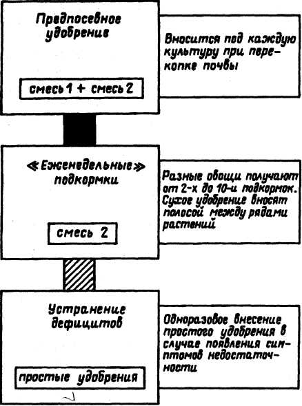 2. В процессе вегетации высокий уровень плодородия почвы поддерживается так называемыми «еженедельными подкормками» — дробным, многократным внесением смеси 2. Ее насыпают узкой полосой на поверхность гряды между двумя рядами растений, а затем растворяют с помощью полива. Частое дробное внесение удобрительной смеси позволяет непрерывно поддерживать быстрый рост культур и обеспечивает высокую степень утилизации питательных веществ.