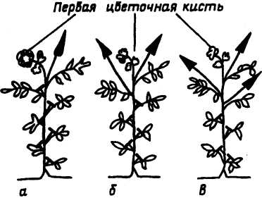 Рис. 10. Формирование куста томата (а) — в один стебель; (б) — в два стебля; (б) — в 3 стебля.