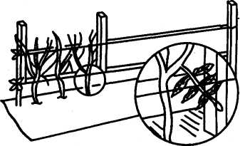 Обеспечить поддержку кустам, сформированным в два или три стебля можно с помощью заключения их между двумя рядами шпагата, натянутого горизонтально ( рис. 12 ). В ряду с растениями устанавливают колья (стойки) на расстоянии 75–90 см друг от друга. Когда растения достигают высоты 25–30 см, к крайней стойке на высоте 20–25 см привязывают широкий синтетический шпагат и тянут его вдоль всей гряды, от стойки к стойке, обкручивая каждую стойку. От последней стойки шпагат таким же способом протягивают в обратном направлении, но по другой стороне стоек. При этом стебли растений оказываются между двумя рядами шпагата. Когда высота кустов достигнет 45–50 см, натягивают следующие 2 ряда шпагата на 20–25 см выше первых двух рядов. В результате стебли и кисти с плодами поддерживаются шпагатом, не будучи к нему подвязанными. Для большинства» детерминантных сортов достаточно 2–х или 3–х сдвоенных рядов шпагата.