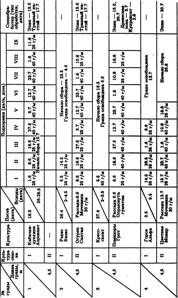 2. Если гряды имеют разную длину, то составьте таблицу, в первом столбце которой будут номера гряд, во втором — их длины, в следующих двух столбцах — дозы смеси 1 и смеси 2, вносимые как предпосевное удобрение, и в последнем — доза смеси 2 для еженедельной подкормки. Такую таблицу полезно повесить там, где вы отвешиваете или отмеряете смеси для внесения их на гряды. В табл. 4 ( раздел 2.4 ) приведены количества удобрительных смесей, вносимые на гряды различной длины.