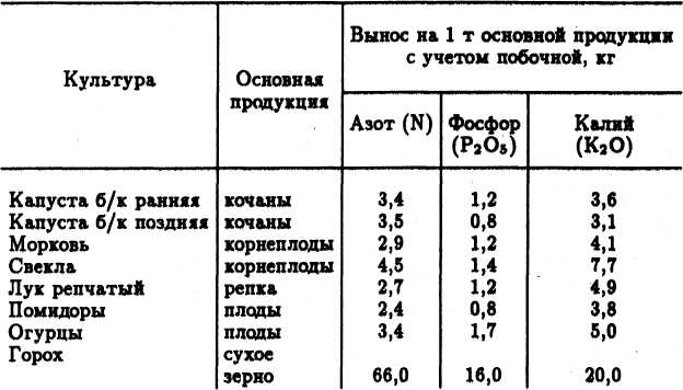 Потребность в питательных веществах можно приблизительно определить по выносу их с урожаем. В табл. 2 приведены количества основных элементов питания (азота, фосфора и калия), которые выносятся из почвы при производстве 1 т основной продукции (кочанов, плодов, зерна, корнеплодов) с учетом всей массы растения (оберточных листьев капусты, листьев и стеблей плодоносящих культур, ботвы корнеплодов и т.д.).