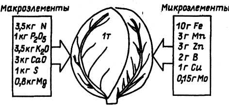 Совершенно ясно, что собрать 1 т кочанов с определенной площади, например, с сотки, можно только в том случае, если растения найдут на этой площади и смогут поглотить примерно 3,5 кг N, 1 кг Р2О5 и 3,5 кг К2О. Кроме азота, фосфора и калия растения должны получить и другие элементы питания (рис. 2). На 1 т кочанов расходуется до 3 кг кальция (Са), 1,0 кг серы (S), 0,8 кг магния (Mg), а также микроэлементы в количествах, измеряемых десятками граммов (С1 и Fe), граммами (Mn, Cu, Zn и В), и долями грамма (Мо и Со). Если такое количество питательных веществ растениям удастся получить с сотки земли, то и урожай будет примерно 1 т кочанов/сотку.