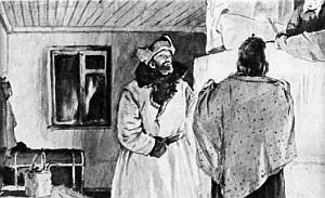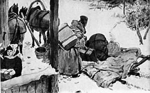 В избушке было тепло. Ямщик пошел задавать лошадям корм, а мать молча раздевала перепуганных ребятишек.