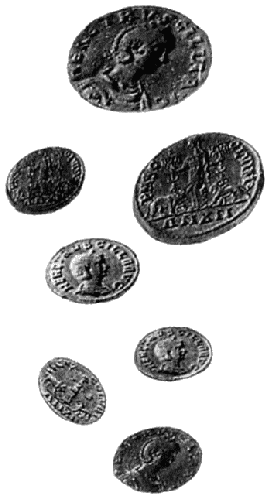 Всего было шесть медных монет и одна серебряная. С оттисками названий городов, где они были изготовлены.