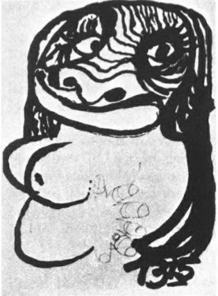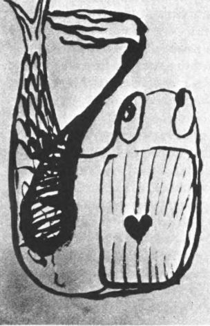 Рисунок, представляющий амбивалентное чувство, переживаемое пациентом, регрессировавшим в своем ЛСД-сеансе до раннего орального уровня. Такая задействованность воспринимается как разрушение объекта (здесь это символизируется огромными зубами) и любовный союз (символизируется сердцем).