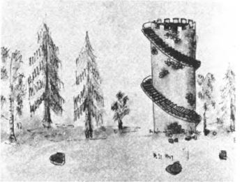 к). Картина, показывающая дальнейшее развитие и модификацию маленькой башни: на ней появилась витая лестница, и она превратилась в наблюдательную башню.