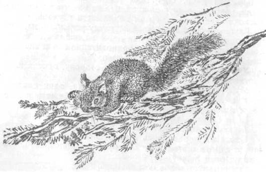 Он лежал по-прежнему без движения. Любопытство разбирало белку всё сильней. Она снова спустилась книзу и уселась на нижней ветке ели.