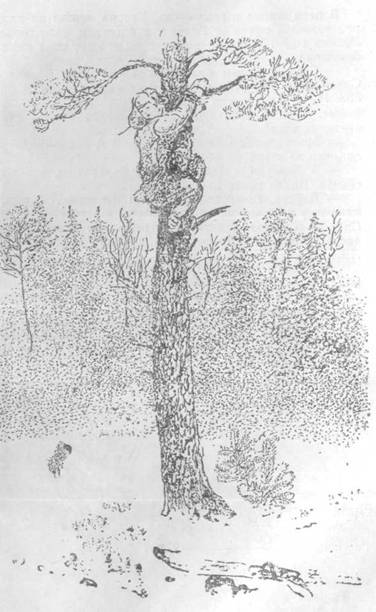 Лесник испуганно вскочил, обернулся… На суку большого дерева, обхватив руками толсты ствол, сидел живой Егорка.