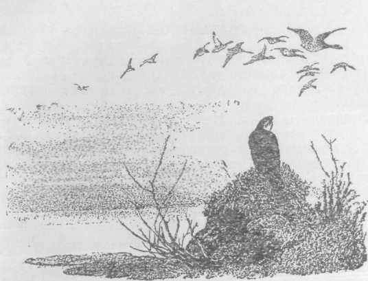 Одна за другой утки, осмелев, стали выплывать из своих убежищ. Сапсан их видел, но не шевельнулся. Его крепкое тело с широкой грудью словно приросло к камню. Когда он не двигался, его почти невозможно было отличить от окружающих камней и комьев земли. Под цвет их удивительно подходила его аспидно-бурая спина, черные перья крыльев и серо-полосатая грудь, брюхо и хвост. Только белое горло выделялось на бурой земле, как светлый камешек.