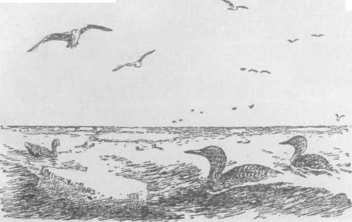 На чаек казарка не обращала никакого внимания. Она всматривалась в серую рябь волн. У самой льдины и дальше в море то показывались, то исчезали в воде ловившие рыбу нырки. Чаще всего попадались на глаза белогрудые гоголи, большие черные турпаны с белой перевязкой на крыле и пестрые длиннохвостые морянки.