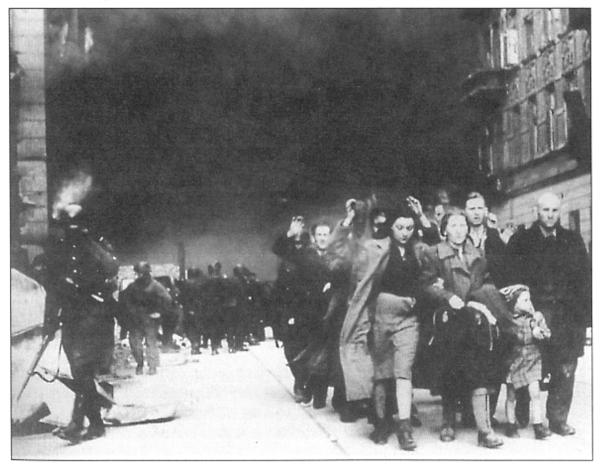Чины СС конвоируют колонну участников восстания в Варшавском гетто, в лагерь Треблинка май 1943.