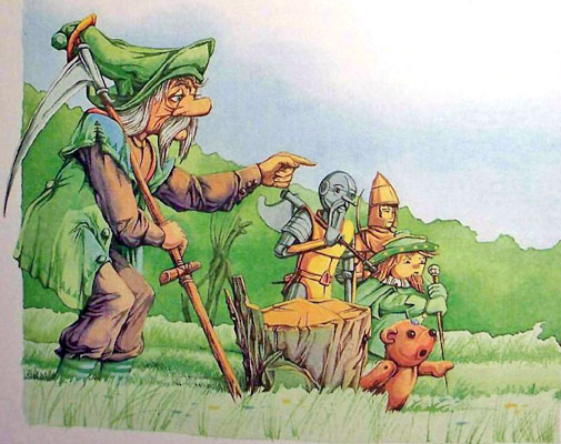 Через полчаса на поляну выехала повозка, которую тащил мохнатый понурый пони. Им управлял старик в широкополой зеленой шляпе. Спустившись на землю, старик достал из повозки косу, немного поточил ее, а затем начал методично косить траву. Заметив сидящих неподалеку путников, старик даже крякнул от удивления и едва не выронил косу.