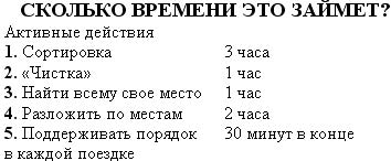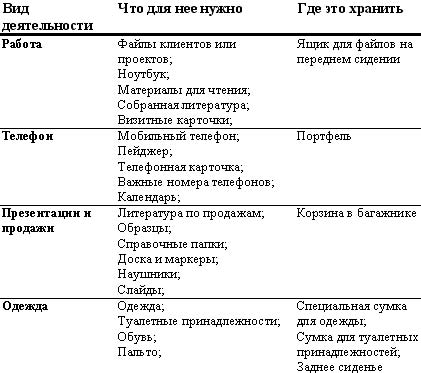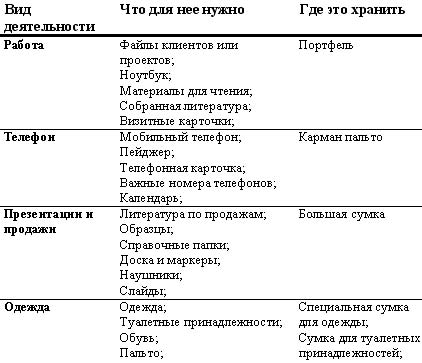 • Сьюзен Л., менеджеру по продажам компании-производителя программного обеспечения, нужно было место для слайдового проектора, компьютера и проводов, диктофона, плейера и кассет, часов с будильником, одежды и обуви (деловой, вечерней и домашней; спортивного костюма и тапочек; ночной рубашки, нижнего белья, носков, колготок, купальника, туалетных принадлежностей, аптечки), запасов на случай непредвиденных обстоятельств (карманный фонарик и батарейки, переходное устройство, сигнальные ракеты, запасное колесо и домкрат, бутылка воды и еда на случай, если она застрянет в дороге, сменное нижнее белье, свитер).