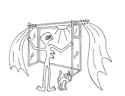 Странно в этой комнате выглядело только окно — круглое, задёрнутое занавеской в цветочек. Иногда за ним был сад, иногда — берег океана, а сейчас там, на чёрном-пречёрном небе, сияла синяя Земля с рыжими пятнами материков.