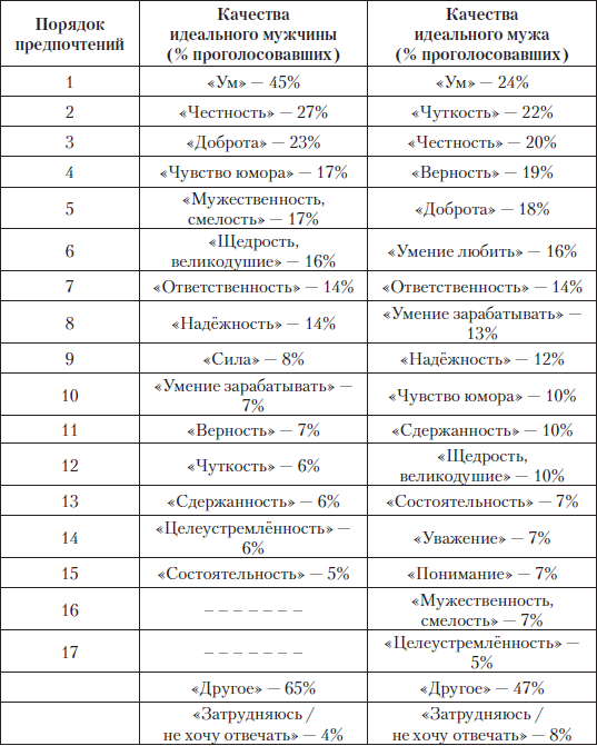Знаменательно, что женщины намного лучше ориентированы в своих предпочтениях, чем мужчины! Затруднились с ответом на вопрос об идеальном мужчине всего 4 % опрошенных, а на вопрос об идеальном муже не смогли ответить всего 8 % россиянок (против соответственно 11 и 18 % у мужчин!). Причем «кивков» в сторону «любовь подскажет» в «женском опросе» не прозвучало вовсе. Что еще раз подтверждает уже сказанное мною в начале второй части книги: женщины намного прагматичнее мужчин! И намного точнее знают, чего хотят – особенно в таком важном деле, как выбор мужчины и мужа.